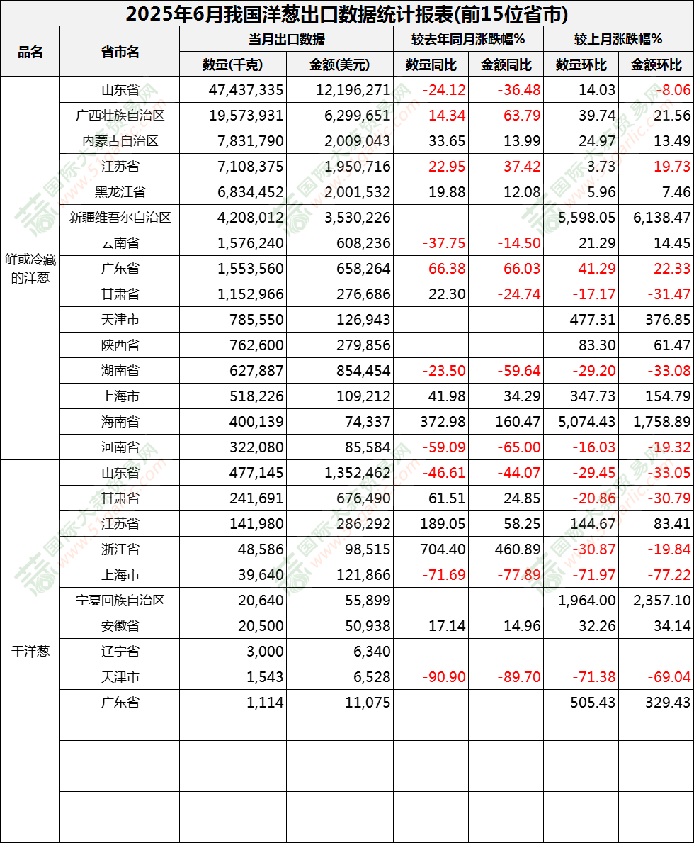 2025年6月洋蔥出口數(shù)據(jù)(按省市)