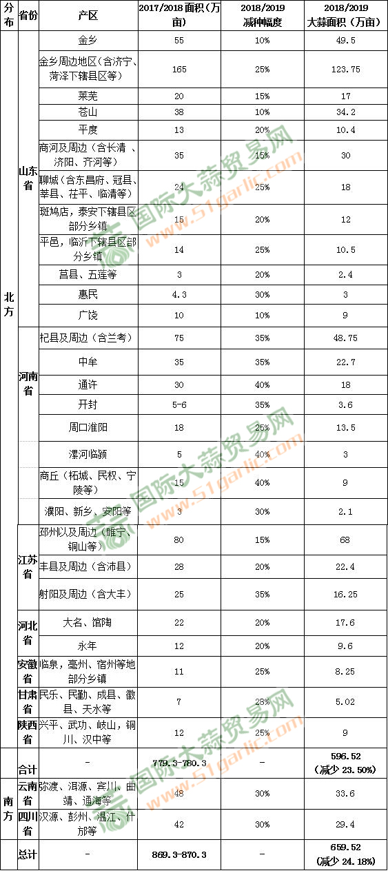 2018-2019年度全國大蒜種植面積統(tǒng)計